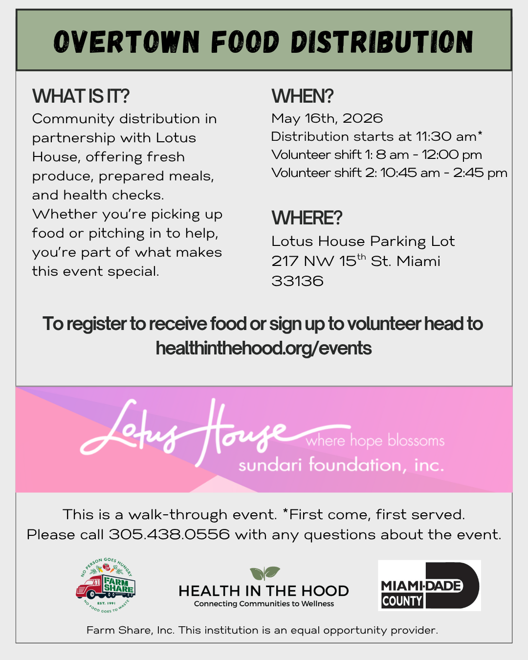Join Health in the Hood and Lotus House as we distribute fresh food, essential supplies, and health services to the Overtown community. This is a hands-on volunteer opportunity where you’ll be making a real impact!